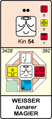 ![]() | KIN 54 - Weißer Lunarer Magier Ich erweitere heute die Plattform meiner Herzenskräfte. Sie sind der Rahmen meines Schöpferpotentials. Sie alleine überstehen alle Zeiten. |
