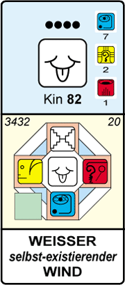 ![]() | KIN 82 - Weißer Selbstbestehender Wind Die Geisteskräfte schaffen heute den Rahmen, damit das Neue Form bekommen und in die Wirklichkeit gerufen werden kann. |